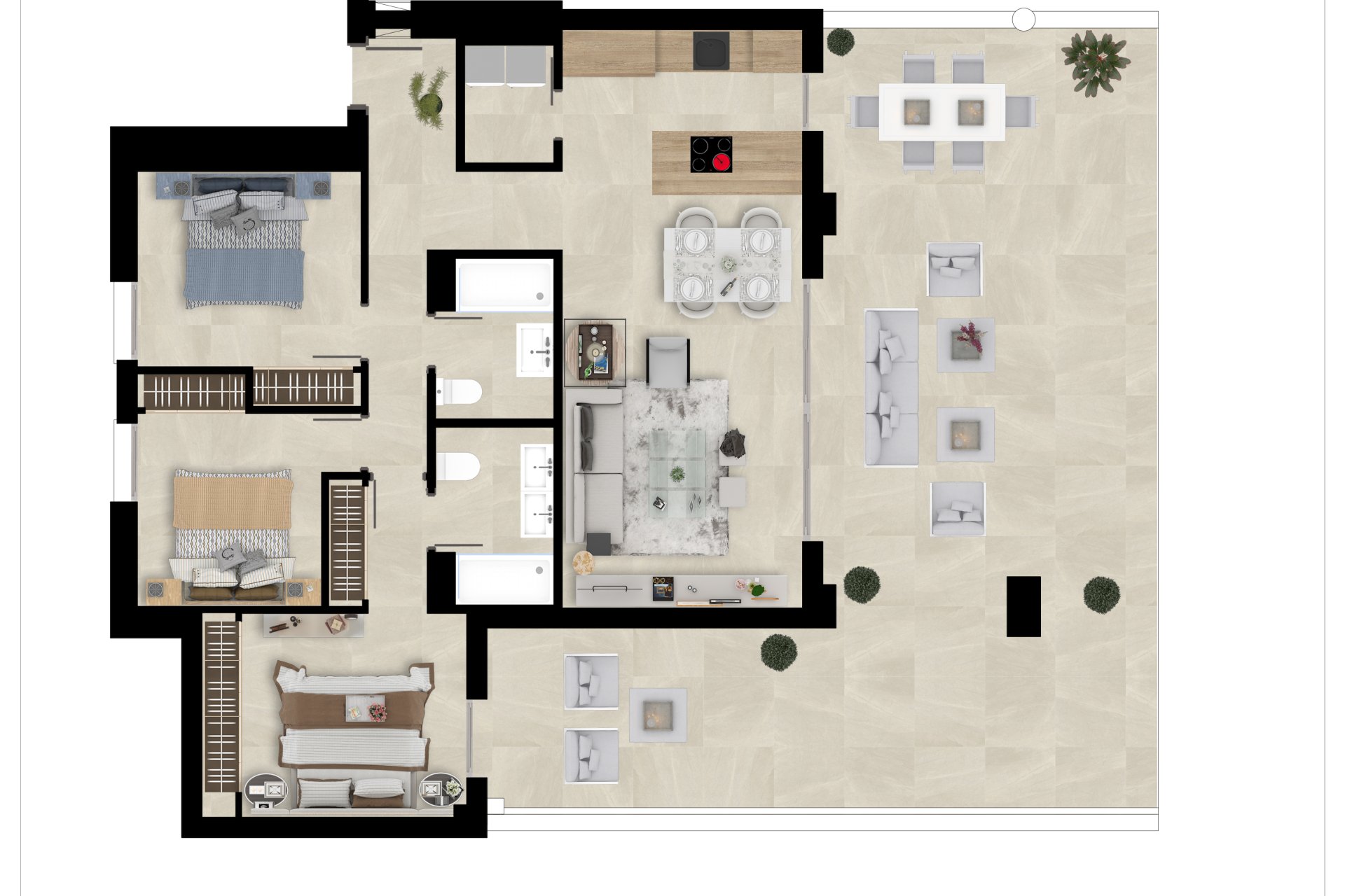 Discover the advantages of living in this privileged enclave in Mijas. The homes feature private terraces that invite relaxation outdoors while enjoying the Mediterranean climate and panoramic views. Some units also offer a solarium as additional space for outdoor leisure. The community gardens provide a green environment that complements the tranquility of the area, also being an added attraction due to its proximity to the golf course.