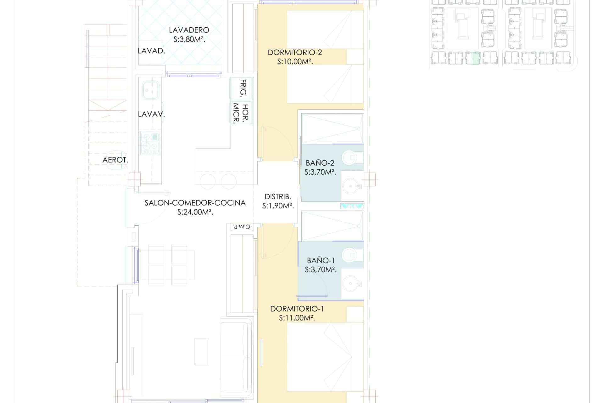The interior of these homes is designed to combine style and comfort from day one thanks to the included furniture. The ceramic floors are not only modern but also easy to maintain. Comfort is amplified with electric blinds and included appliances, while the built-in wardrobes optimize storage space. Additionally, the pre-installation of air conditioning ensures a home ready for any climate.